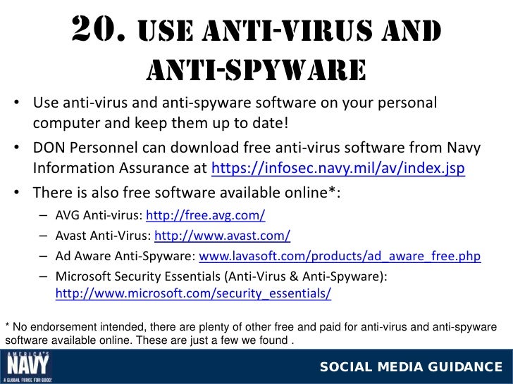 Members of the Armed Forces and DoD Civilians can take advantage of a free license for McAfee Antivirus in 2019. This program, offered by the Defense Information Systems Agency, or DISA, allows for members of the DoD to protect their home computers. Free Anti-Virus Software Available to DoD Employees DoD Web sites now offer free anti-virus software intended for use. Www.infosec.navy.mil, and click on “Anti-Virus Information.” The same. Service members and authorized civilians can now get free antivirus software. The Infosec Web site at has complete.
